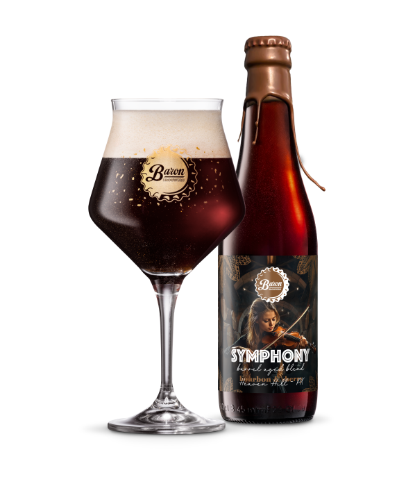 Als twee werelden samenkomen, ontstaat Symphony, de barrel aged blend quadrupel bourbon sherry van Baron Brouwerij. De diepe, warme tonen van bourbonvaten van Heaven Hill en de weelderige zoetheid van Pedro Ximénez sherry-vaten vormen samen een symfonie van smaken. Een rijke compositie van Baron Brouwerij van eikenhout, vanille, karamel, rozijnen, kruidigheid en fluweelzachte rijkdom - zorgvuldig op elkaar afgestemd als instrumenten in een orkest.