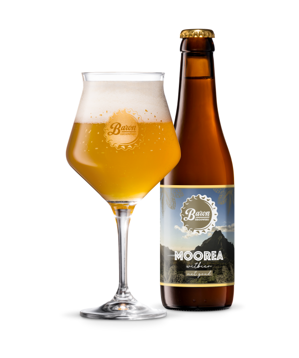 Ontdek het gevoel van avontuur en exotische schoonheid van Moorea witbier, het troebele verfrissende witbier met goud van Baron Brouwerij.